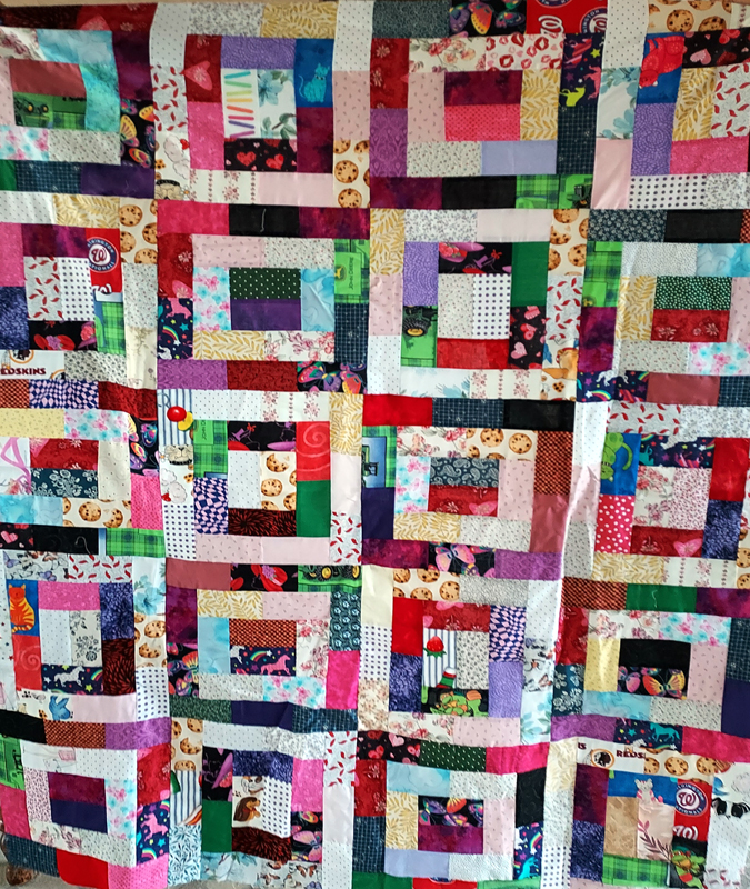 This was the first quilt project that I took on. It is called Broken Courthouse Steps. I had all but three blocks done before Sandra left in early September. I finished those three blocks right after and then put the rows together. This one is great as there are no seams to match except the union of the blocks. I have another "kit" using this pattern in my favorite Patriotic colors. It will use a different unit and block arrangement than this one. More on it in a future post. The back is ready for this one. Another piece of yardage from my stash.